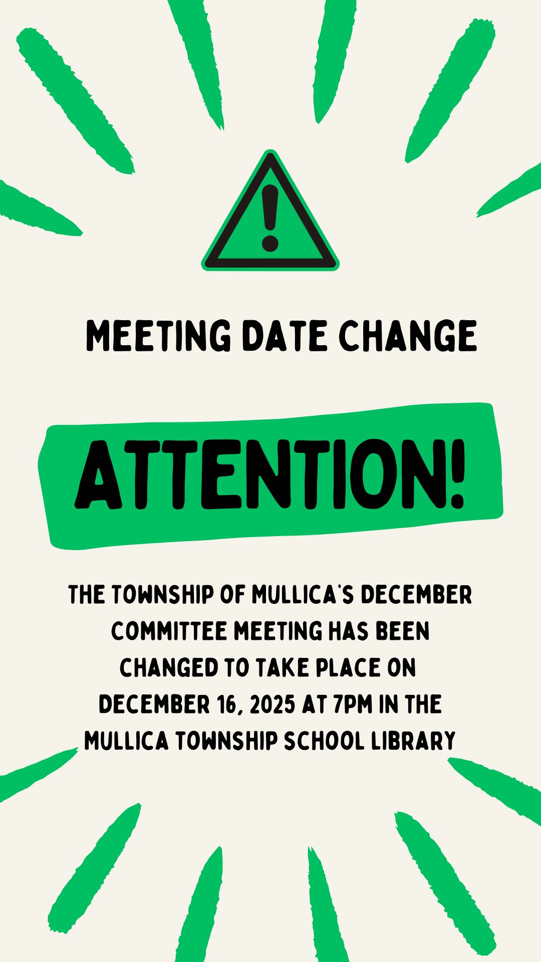 The Township of Mullica Draft Agenda for Regular Committee meeting to be held on November 25, 2025 at 7pm in the Mullica Township School Library