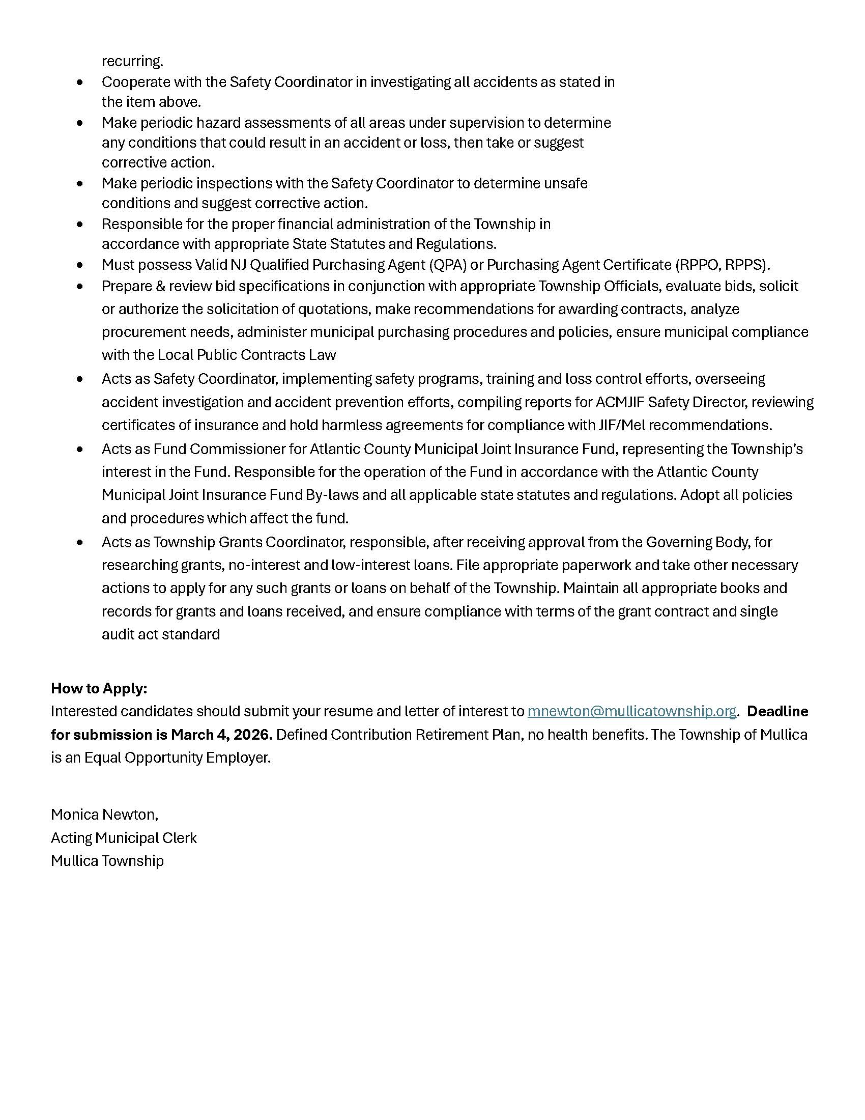 MULLICA TOWNSHIP EMPLOYMENT OPPORTUNITY