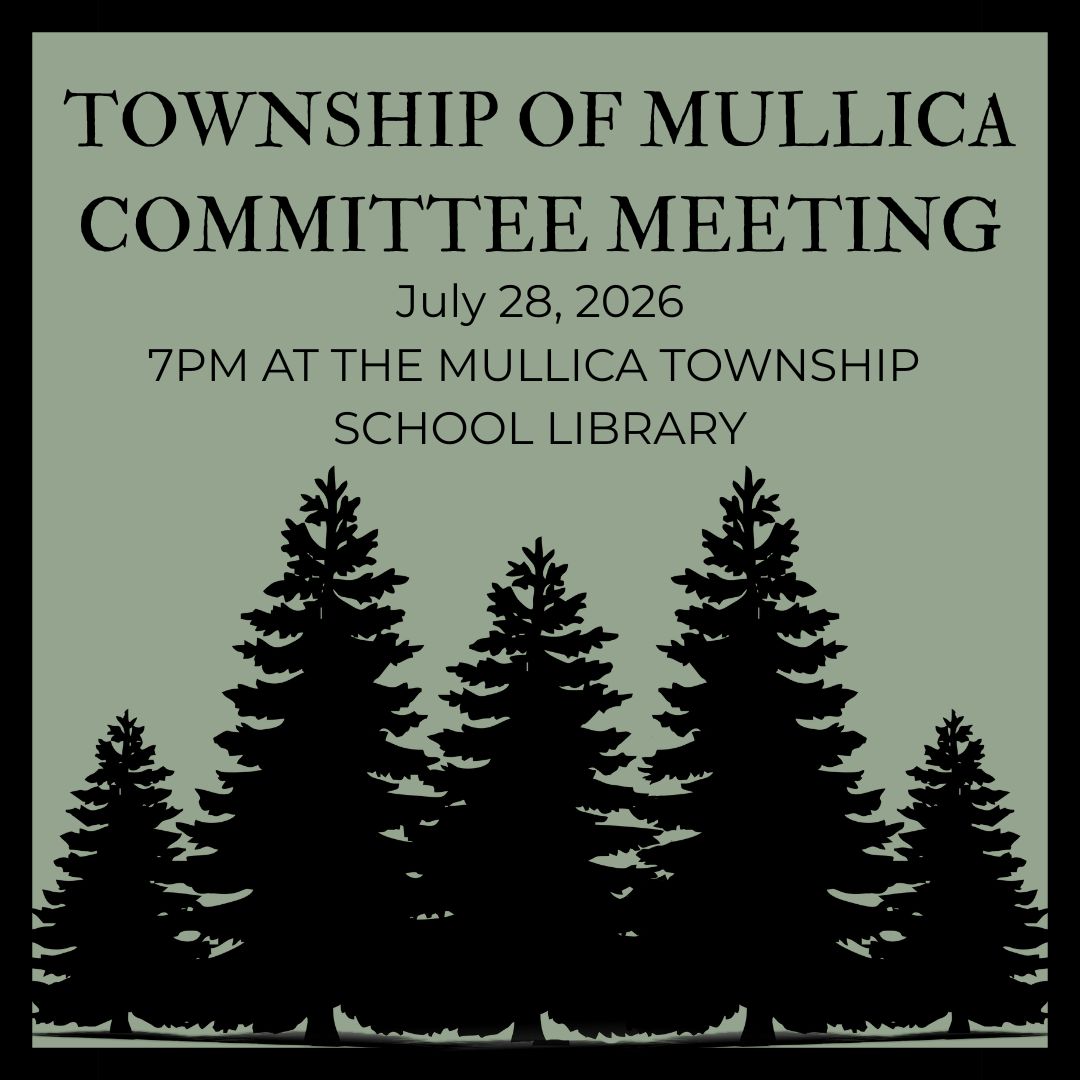 Township of Mullica Committee Meeting to be held on July 28, 2026 at 7pm in the Mullica Township School Library at 500 Elwood Road, Elwood, NJ 08217