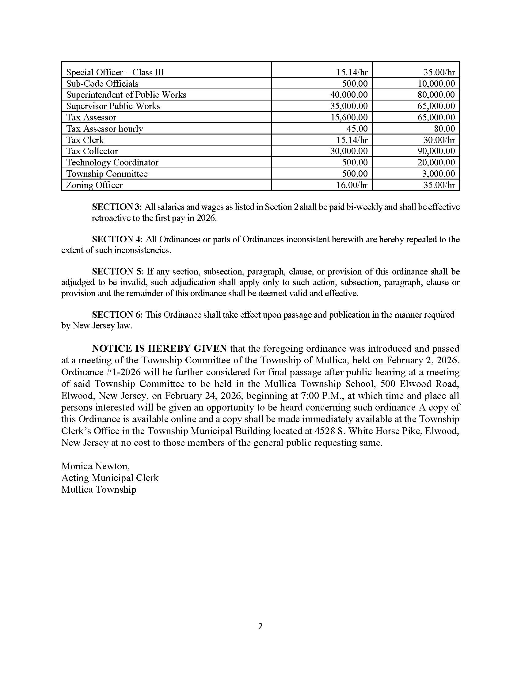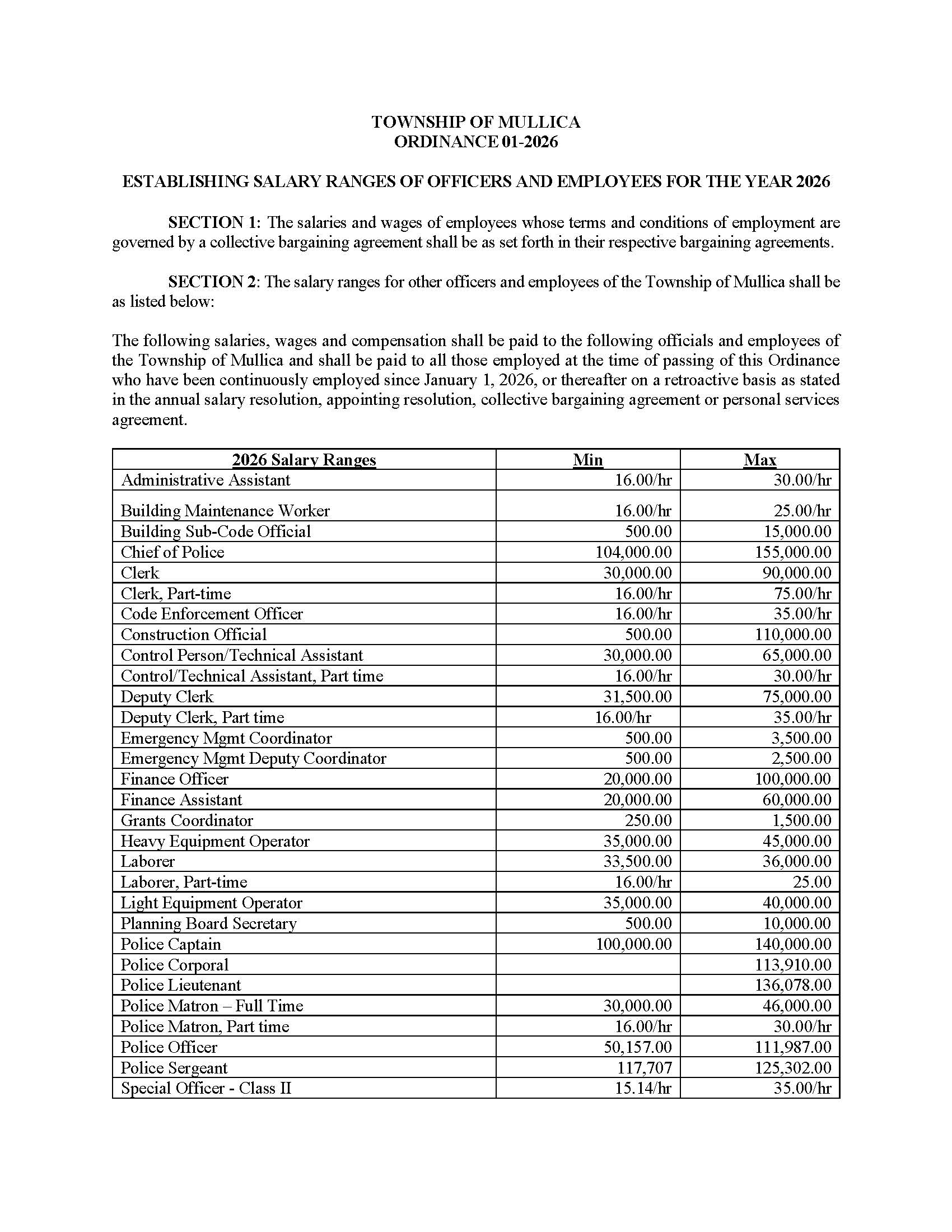 ORDINANCE 01-2026 First Reading ORDINANCE 01-2026 ESTABLISHING SALARY RANGES OF OFFICERS AND EMPLOYEES FOR THE YEAR 2026 View Legal Notice tstanley@mullicatownship.org2026-02-12T11:27:27-05:00 Share This Event! FacebookXLinkedInWhatsAppPinterestEmail
