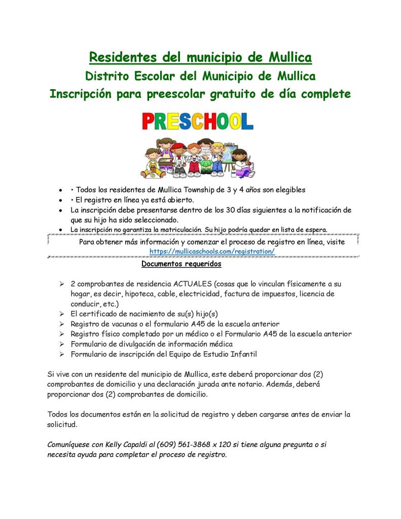 PRESCHOOL REGISTRATION 2026/2027 School Year Mullica Township School District tstanley@mullicatownship.org2026-04-22T10:25:55-04:00 Share This Event! FacebookXLinkedInWhatsAppPinterestEmail